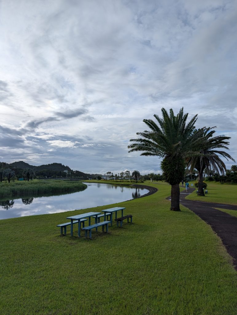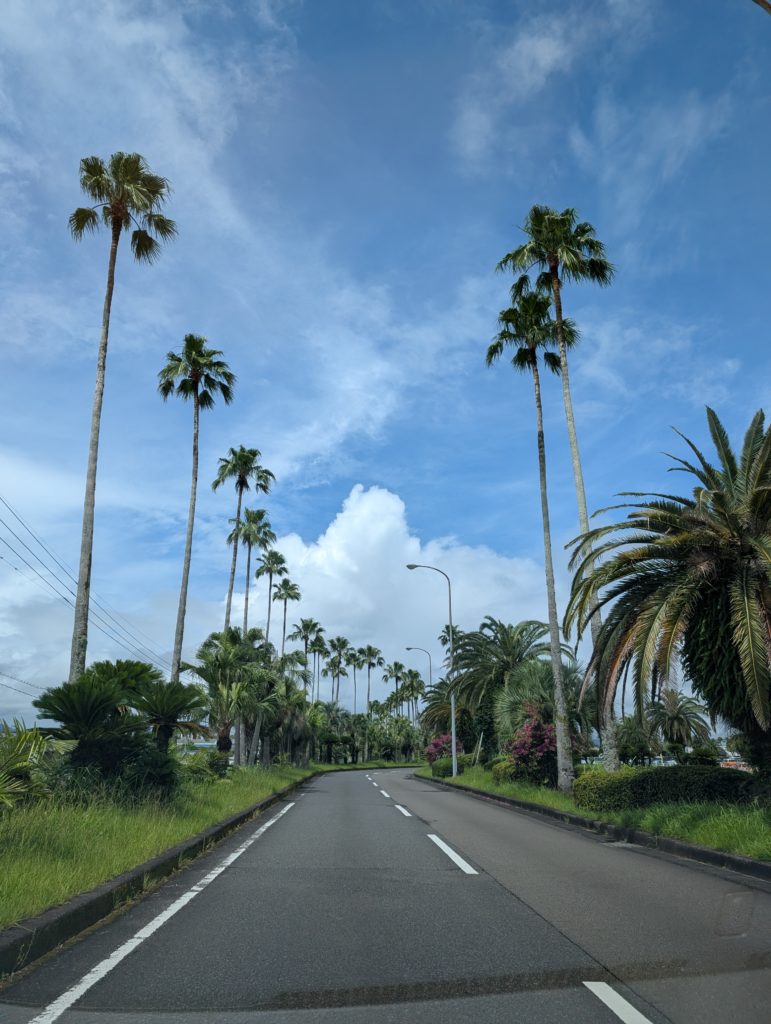 空港からの道路もすっごい南国感。なんとか雨は止んどりました。私、晴れ男ですから(笑)。