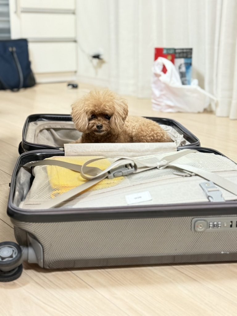 旅行カバン出すと察するかわいい娘のシェリにごめんねしながら準備します。たった一泊の荷物なんですけどね(笑)。