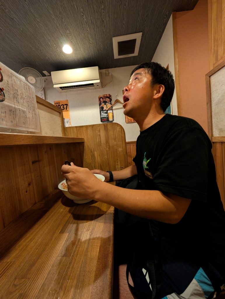 とっても長い中締めの挨拶を聞いて店を出ました(笑)。ヨシキとジュンヤ、アッコさんは街に消えていったので、私は道子さん、カトウくんと「辛麺」なるものを食べに行きました。