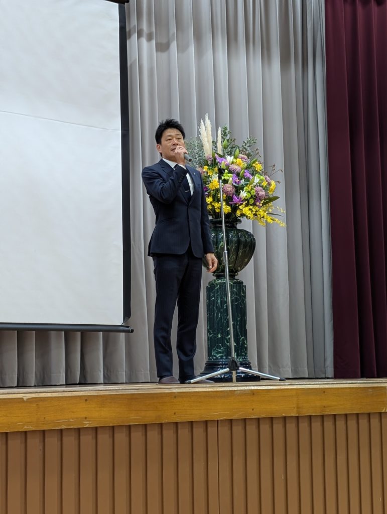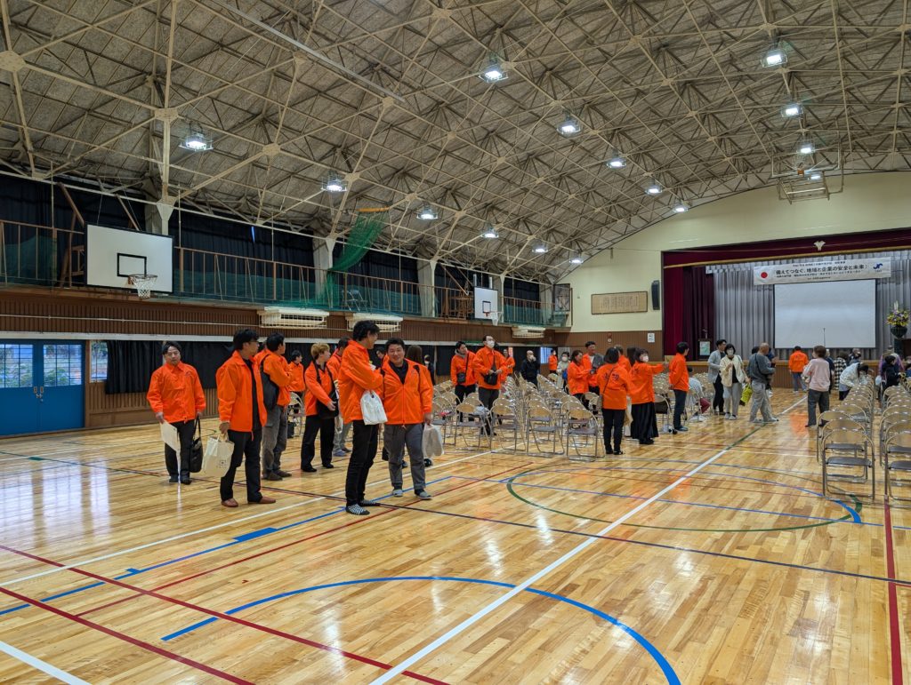 会場は鬼崎中学校の体育館。毎年ソフトボールの練習試合をする私たちにも馴染みのあるところです。前日にもメールで駐車場の案内をいただいておりましたが、YEGに向けた研修会ではなく一般参加型講師講演といった設え。350名もの参加者を見込んだもので周辺に臨時駐車場を設けておりました。