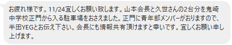 なんという心遣い!杉江さんありがとうございました!ということで作業着に作業車でしたが一番近くに停めさせていただきました。周辺にはオレンジジャンパーの常滑YEGさんがたくさんいて、駐車場の誘導もしっかりされていましたよ~。