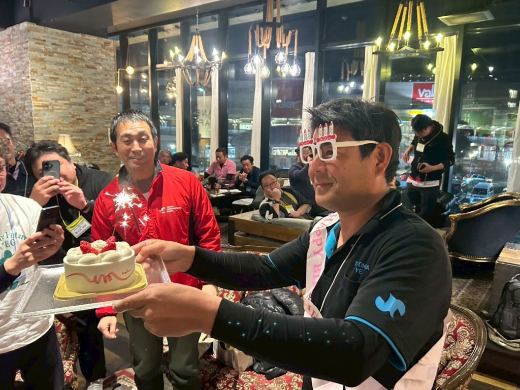 するとなにやら掛け声が。「ハッピ バースデー トューユー♪」の声と共に出てきたのはケーキ。そう、本日は「一番初めはイザワから」でお馴染みの豊川YEGイザワさんの誕生日。せっかくなのでとみんなでお祝いしました。