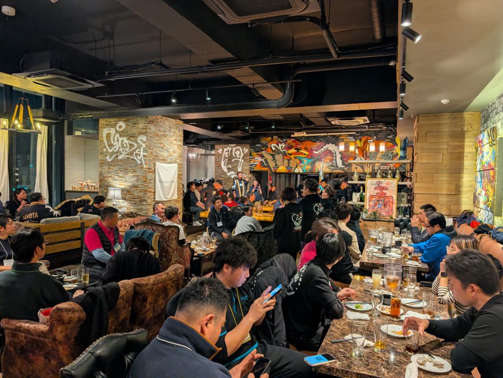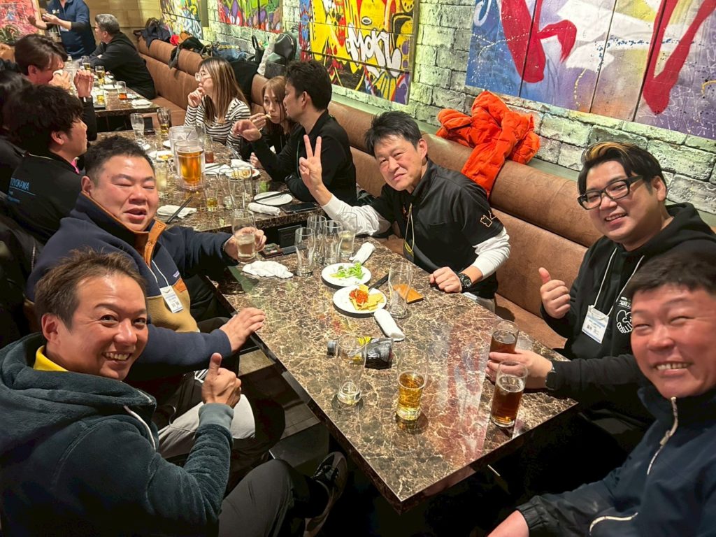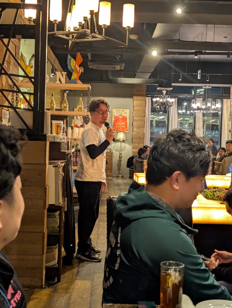 そして乾杯へ。原田さんが遅参だったので、代わりに平出くんからご発声。チームごとに座っていたのでさっきまでのメンバーで勝利を祝いました。