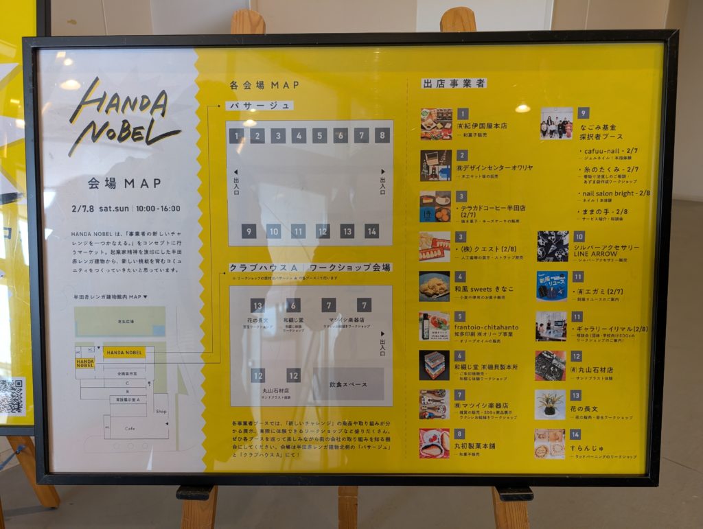 こうして本日参加のアッコさんと合流して会場の赤レンガ建物に向かいました。「HANDA NOBEL」というイベントで「事業者の新しいチャレンジを一つかなえる」というコンセプトの物販・ワークショップ。