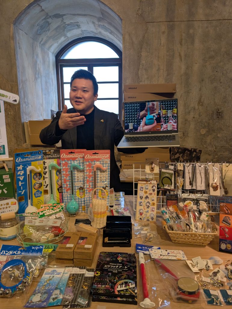 私たちは今からランチに行くんですが、お腹の空いちゃったヒロモトくんはアリサちゃんとこの「赤飯おにぎり」と「お饅頭」、東海くんとこの「クッキー」を刈谷までのおやつに購入。そして前々から欲しかったという「オタマトーン」というなにやら不思議な楽器をゲットしておりました(笑)。