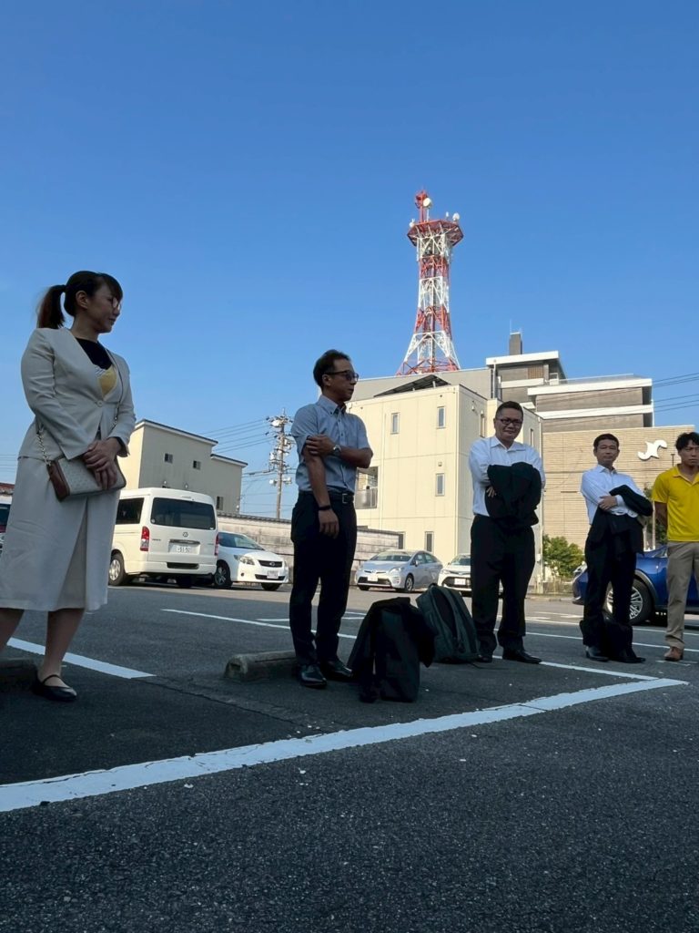 まずは朝礼から。なんとOBの中川さんが見送りだけと来てくれていました!