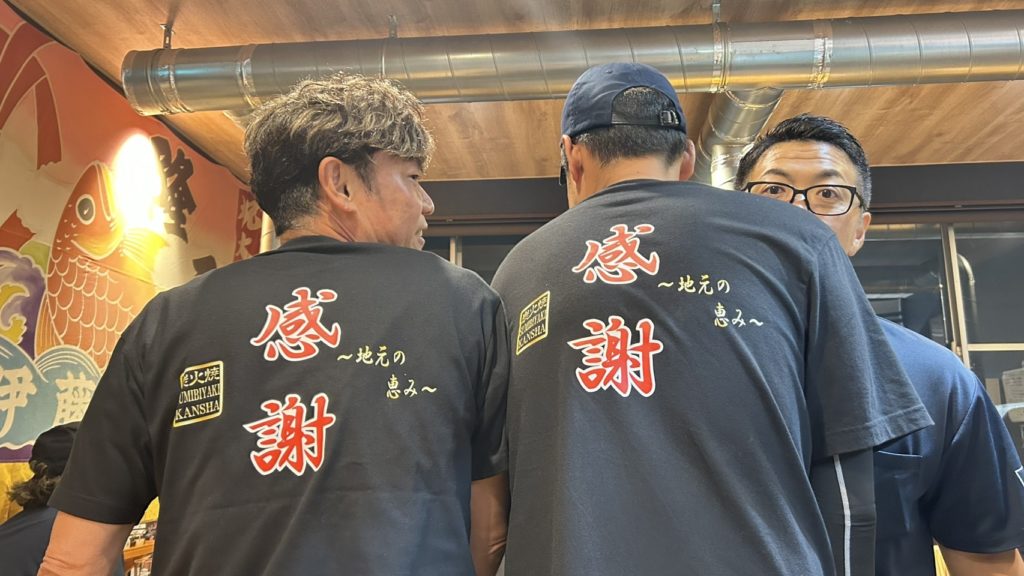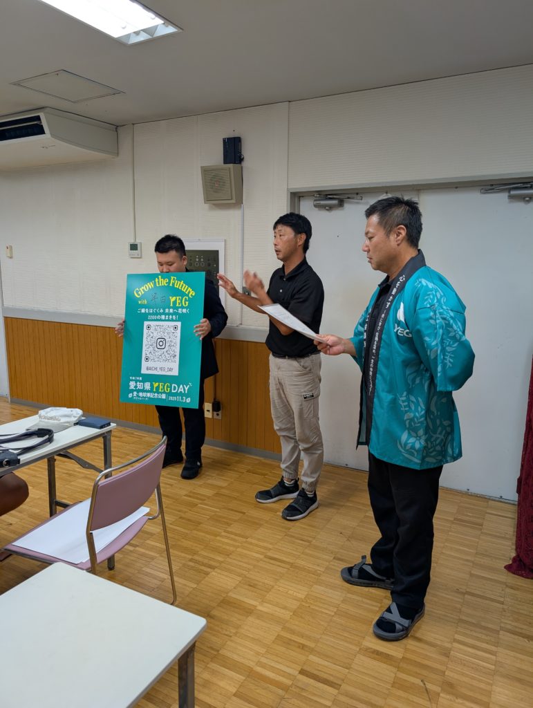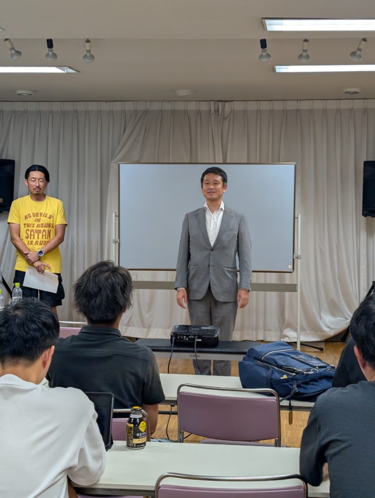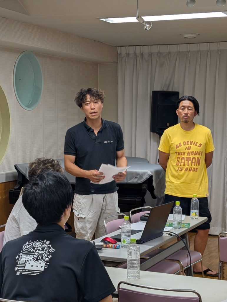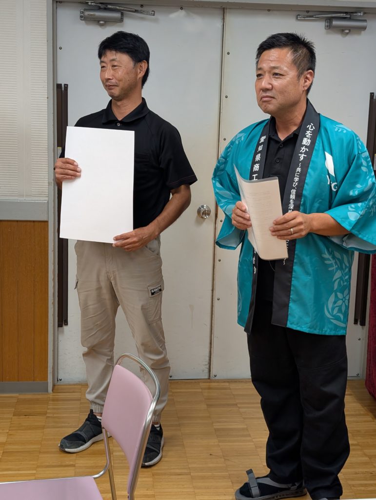 総務委員会で本日出席のタカシくんもお手伝い。会場主の竜一郎も交えてPRします。