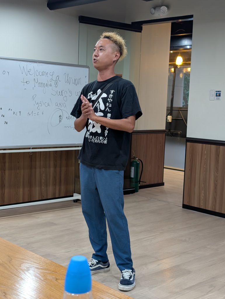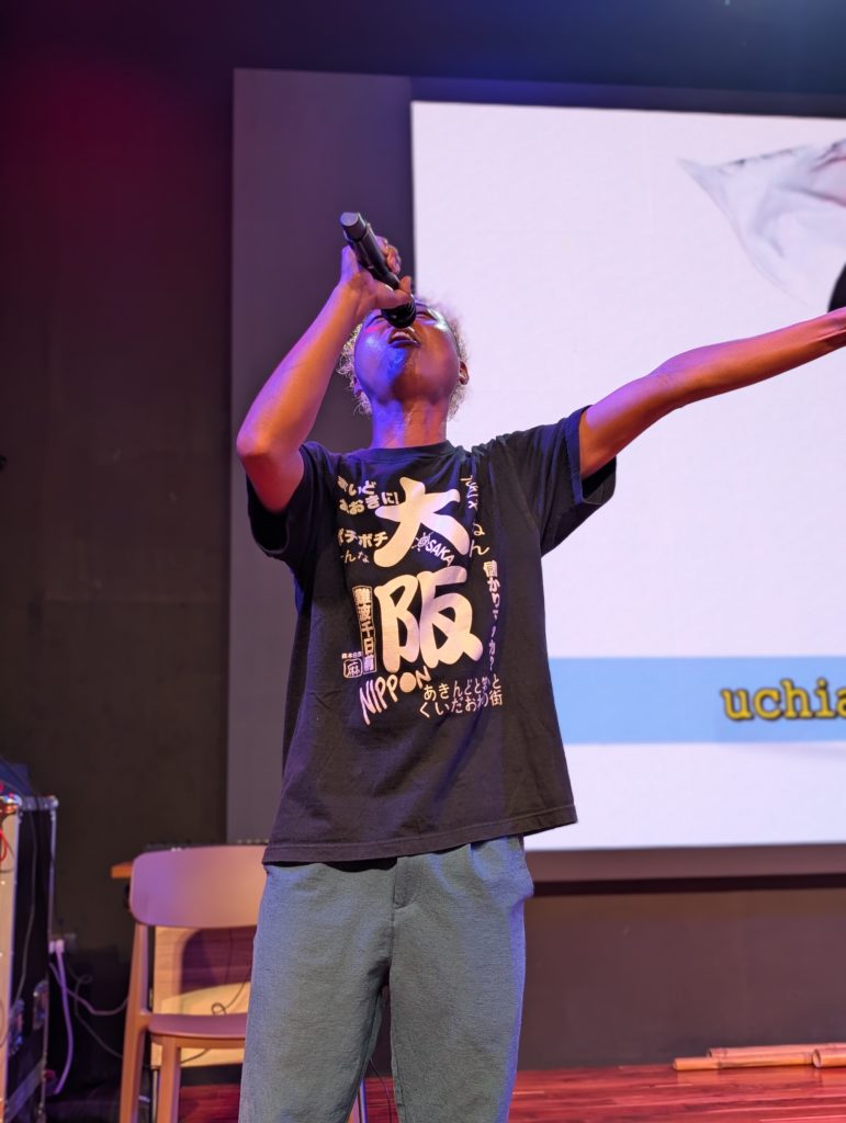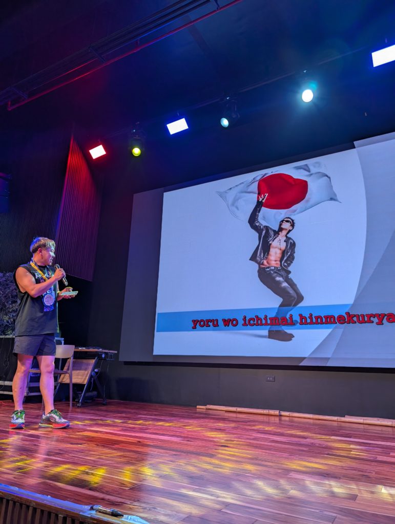 司会はジュンヤ。その後主催者代表ということで私の挨拶。そしてライコウさんから特別ゲストの紹介という流れで総領事から挨拶をもらいます。会場には国籍もわからない生徒さんたちが食事をしながら聞いている状況。私は誰に向けた挨拶をすればいいんでしょう(笑)。