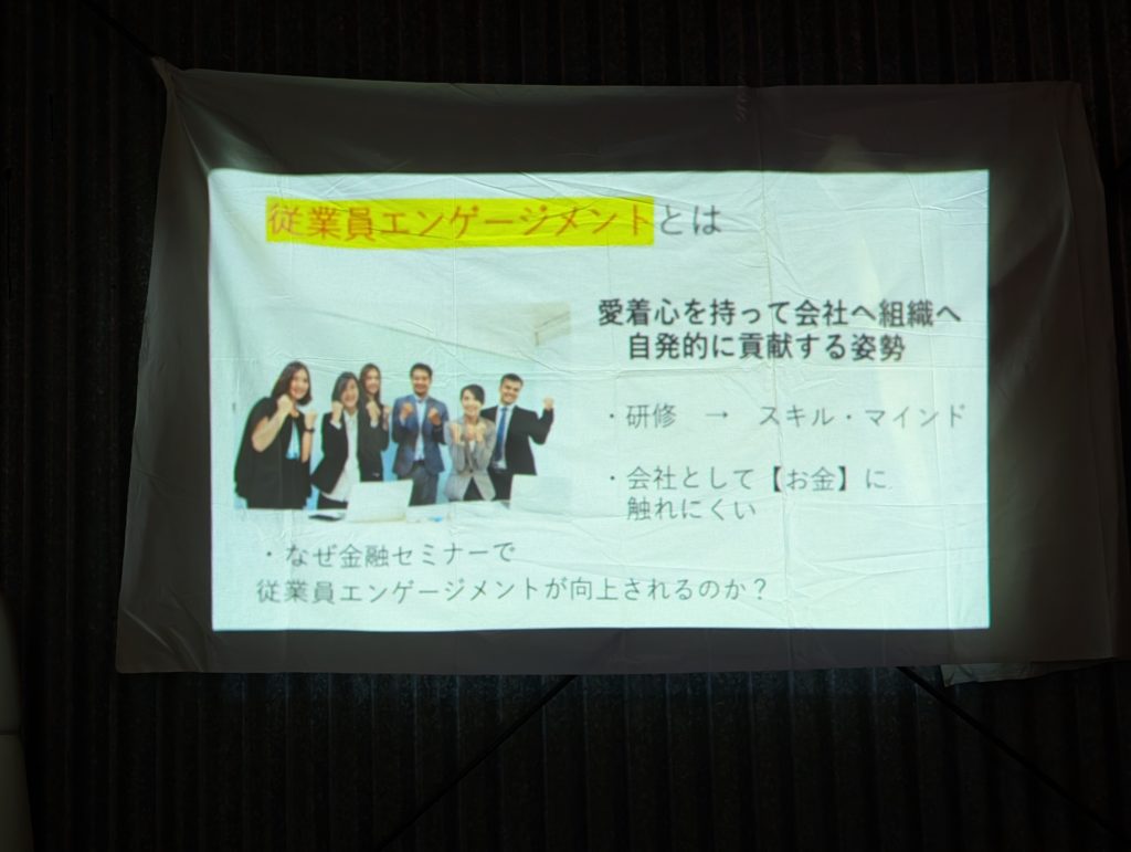 そんなマサヤくんからは「金融セミナーを活用した従業員のエンゲージメント向上」について。某メガバンクの統計でも金融セミナーを会社が行うことで、従業員のエンゲージメント向上につながったデータがあるそうで、その理由や活用方法について教えてもらいました。