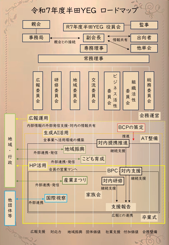 さて、本日は表題の件。今年度は「未来への可能性を模索する年」と掲げて一年の事業計画を検討しました。YEGでは「自己研鑽」→「自社発展」→「地域振興」というルートがよく言われますが、そもそも会員に伴走する組織として違う機能を持たせられないのかな。という考えから始まった「ビジネス活性」・「組織活性」の両委員会。