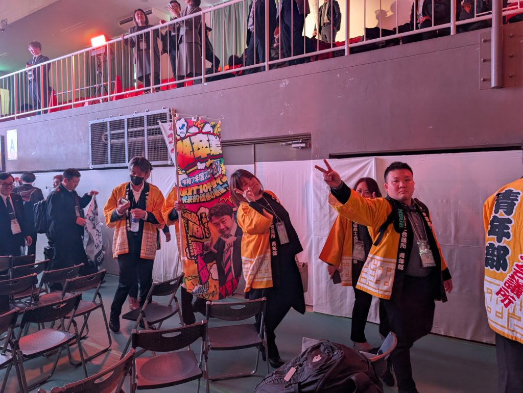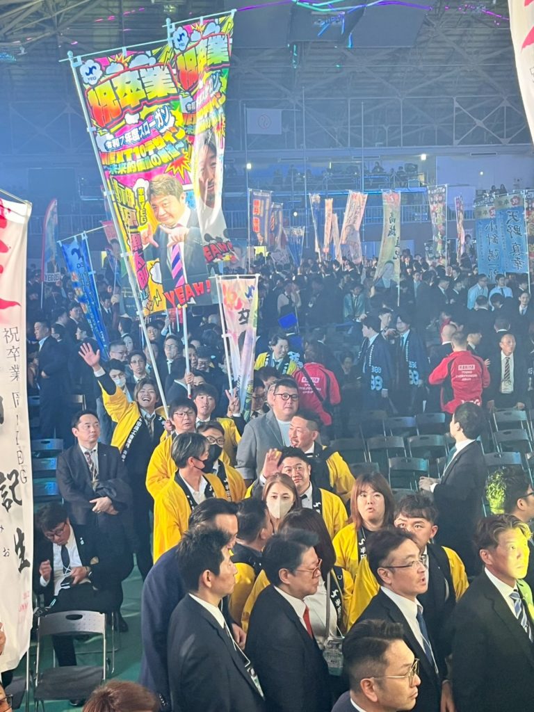 ということでこの後は記念事業へ、いわゆる卒業式です。知一郎会長からの送辞、そして卒業生代表からの答辞と続き、恒例の幟を上げての登壇です。
