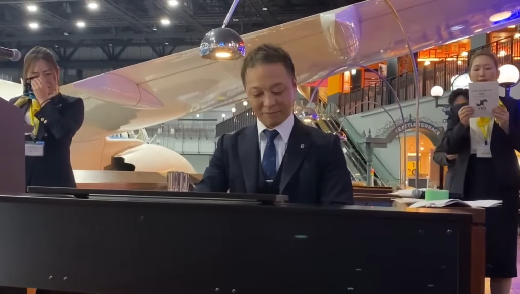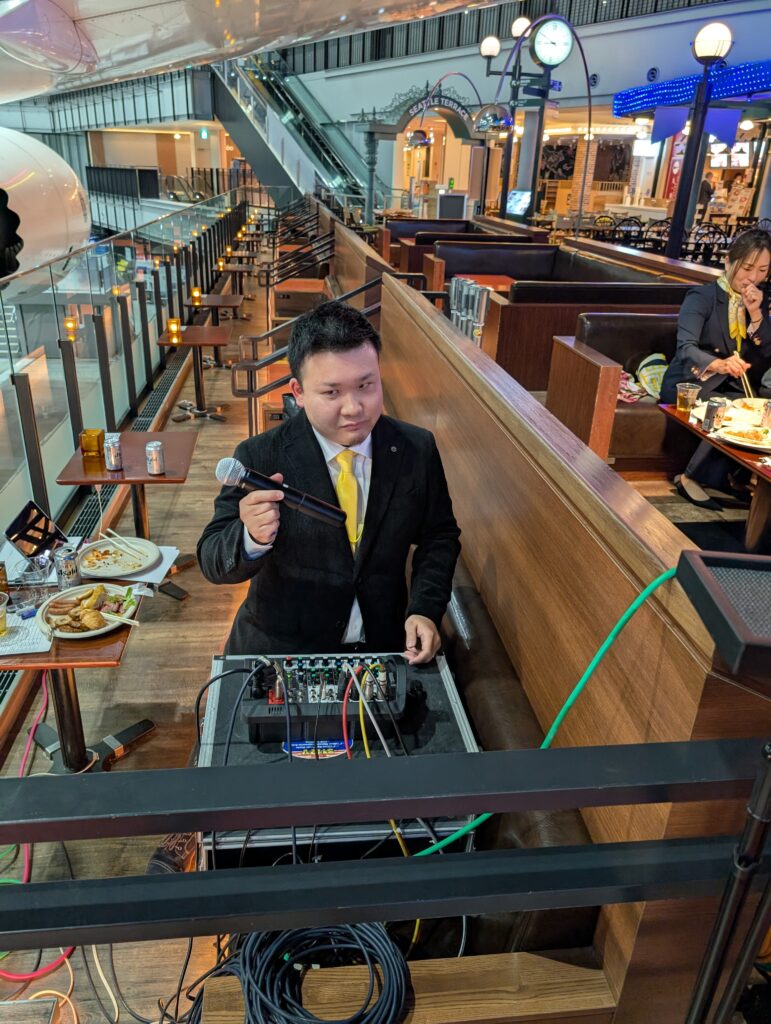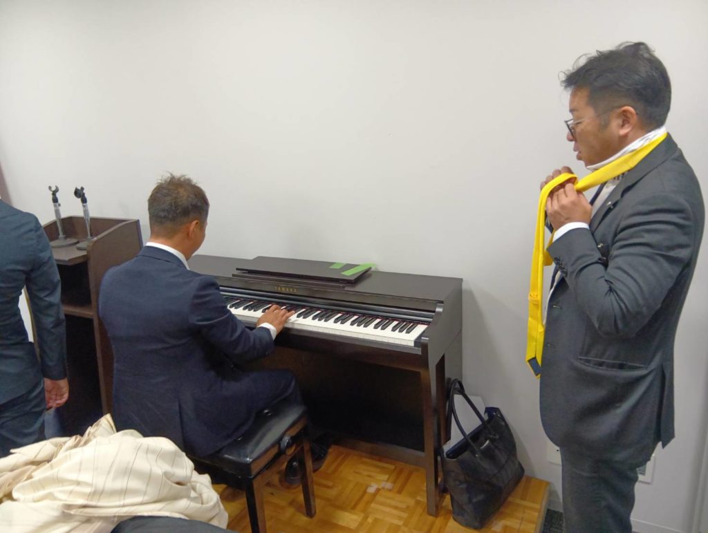 そんなことをしながら7人でワチャワチャとセントレアに向かいました。第2ターミナルの駐車場で「あ!私のスマホないかも!」とか言うミオコさんのオテンバぶりを見ながら控室に移動。すかさず男性チームがピアノや備品類を運んできます。