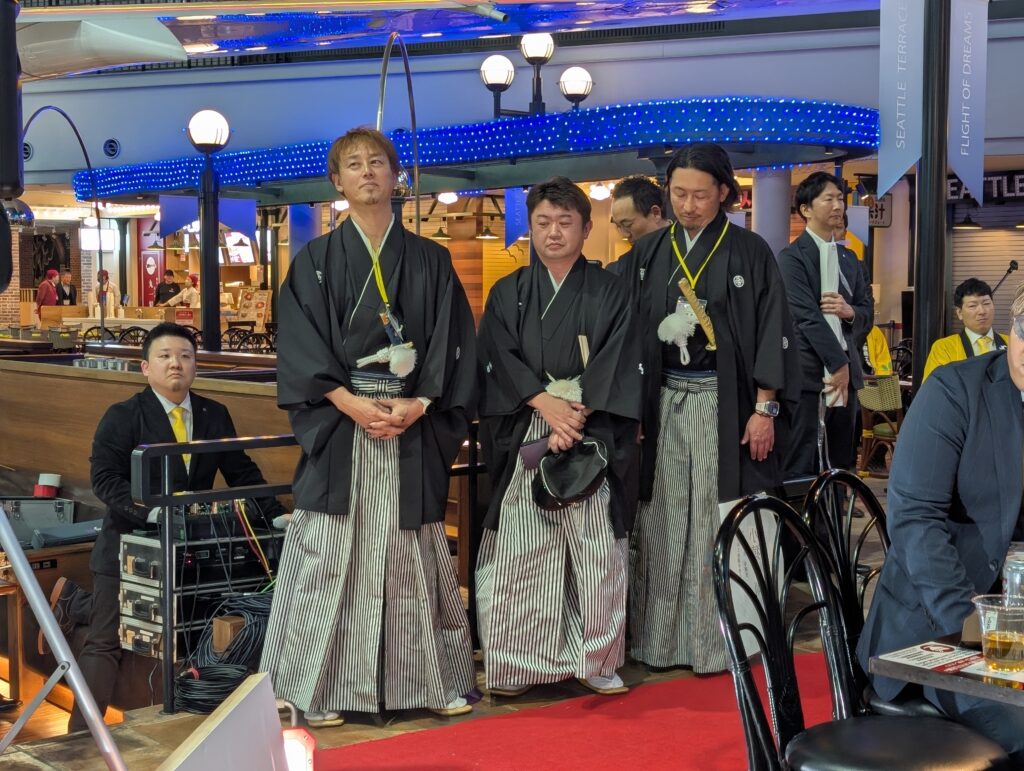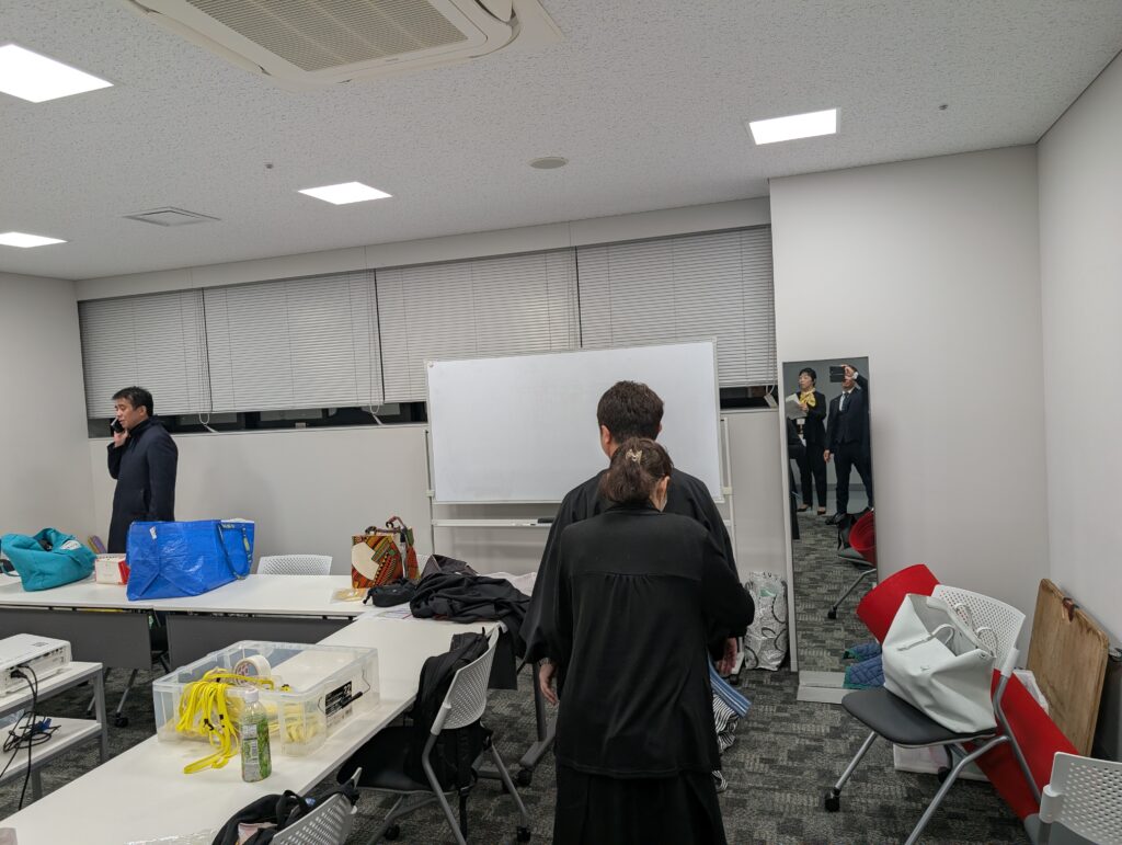 一人遅れているのはケンタロウさん。弁護士さんなんですが、実は本日は静岡で裁判がありギリギリになりそうとのこと。「大丈夫かな~」と心配しておりましたが、なんとか開会前に間に合い、急ぎ袴にお着替えします。