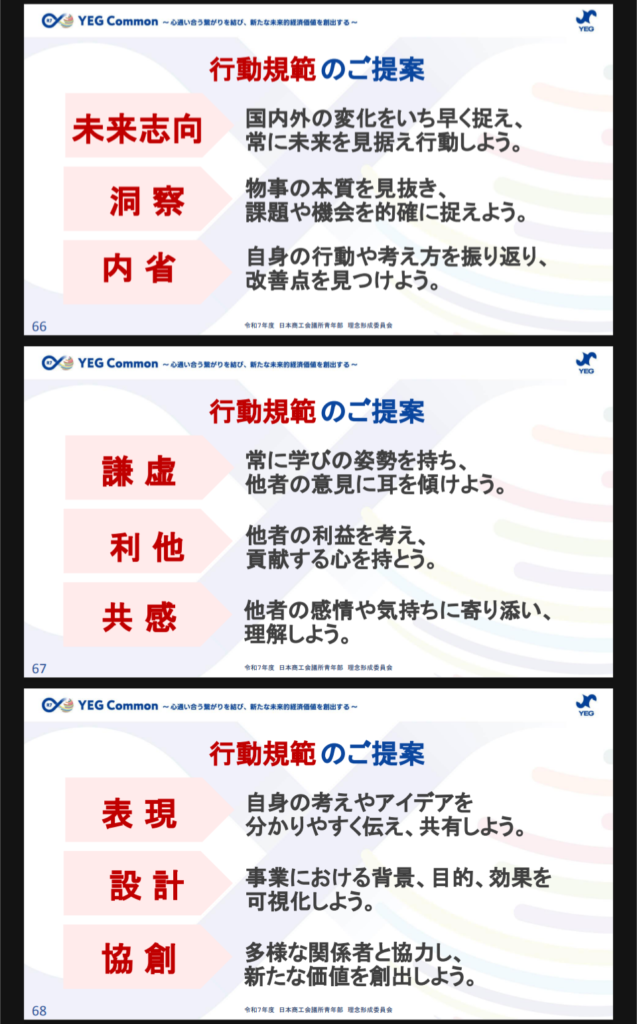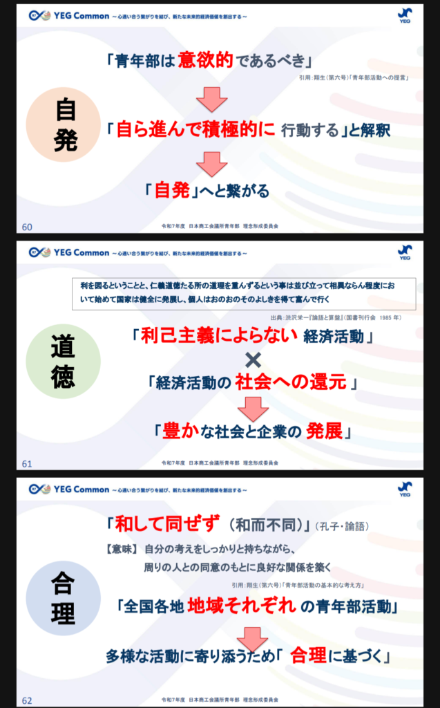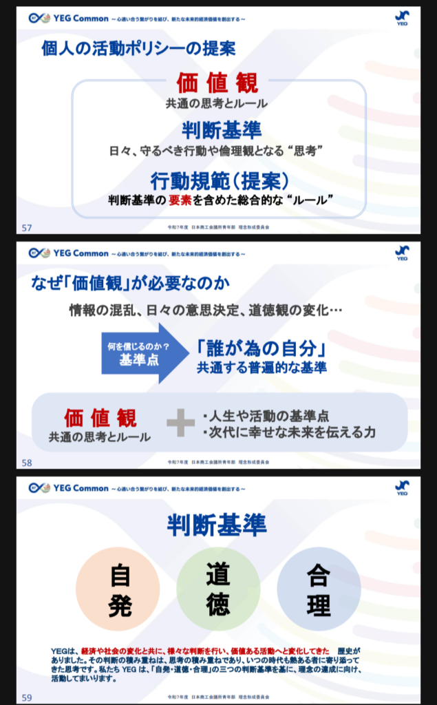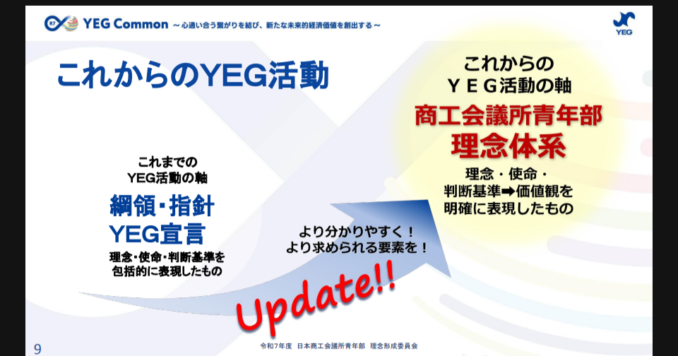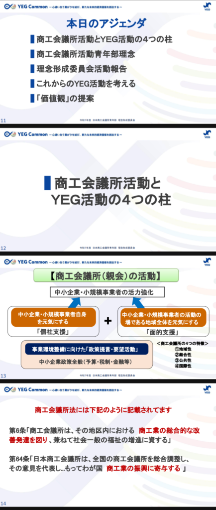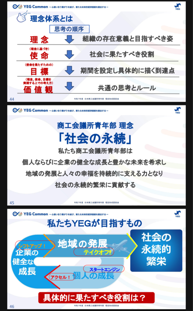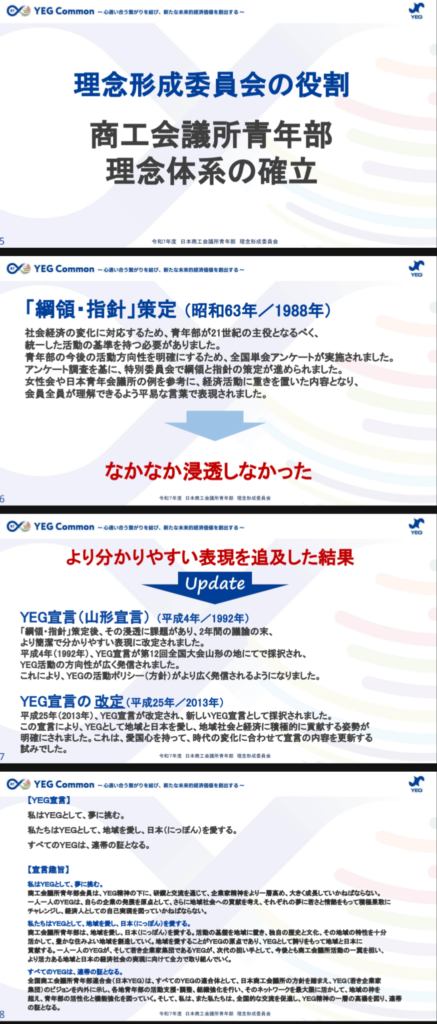 その後は日本YEG理念形成委員会さんからのお話。綱領・指針を全体に浸透させられるよう「理念体系」として表現するとのこと。