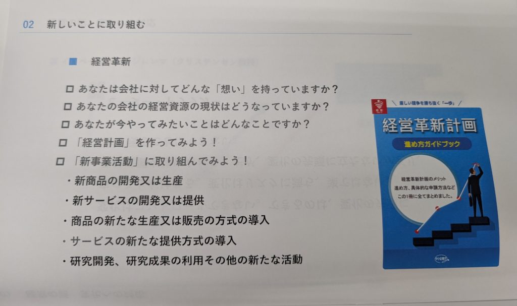 続いては「新しいことに取り組む」ということ。実際にどうすればいいか、ズバリ「経営革新」です。