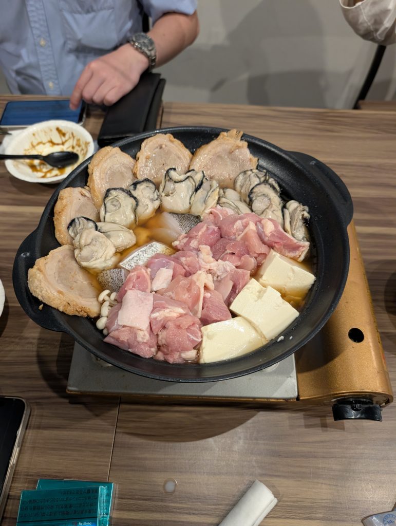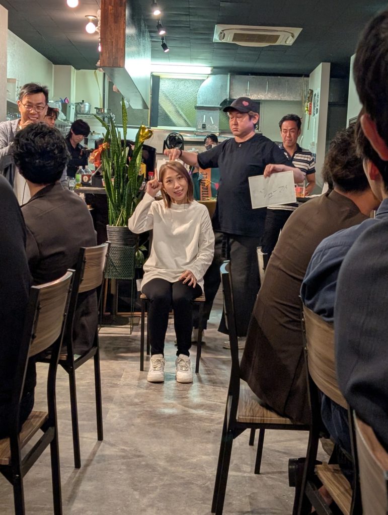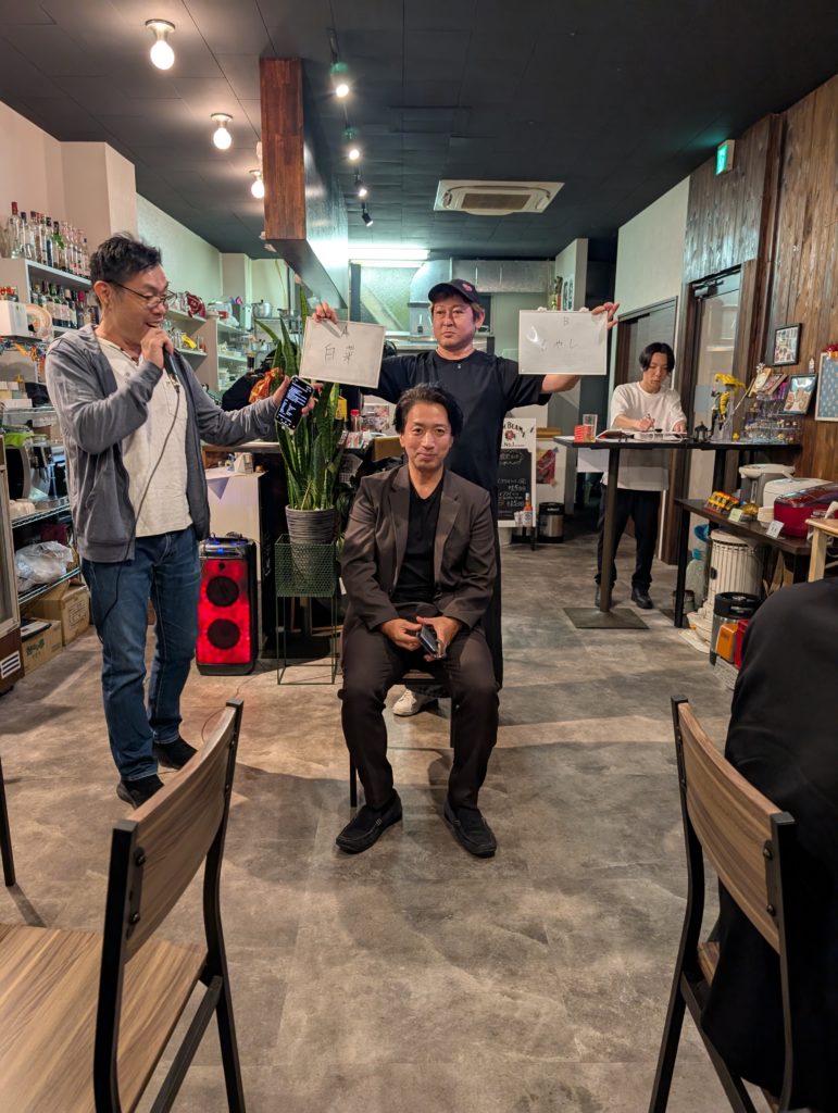 今日は「オリジナルの鍋」を作るというもの。二つのテーブルに分かれて座ってましたが、AとBということにして代表者が数名出て食材を見ずに選択していくという流れです。