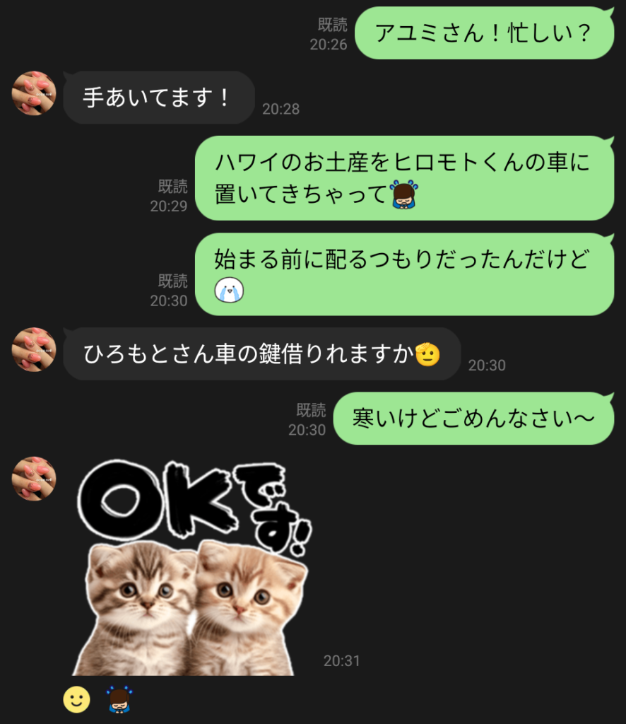 残りは報告事項のみ。というこのタイミングで急に思い出しました!ヒロモトくんの車にお土産を置いてきた!と。