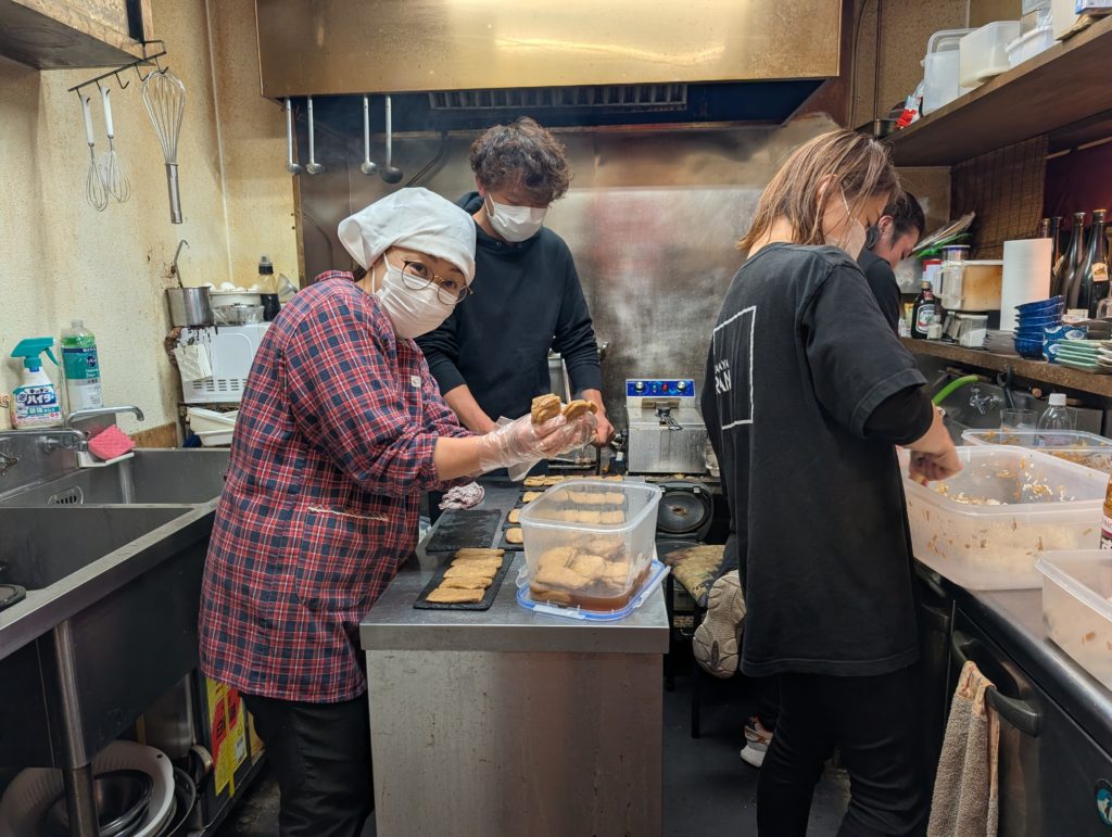 こちらは厨房班。今日はらんの若大将「りょう」くんも手伝ってくれました。ジュンヤはせっせと焼き印を押して、ミオコさんはその稲荷を準備していきます。