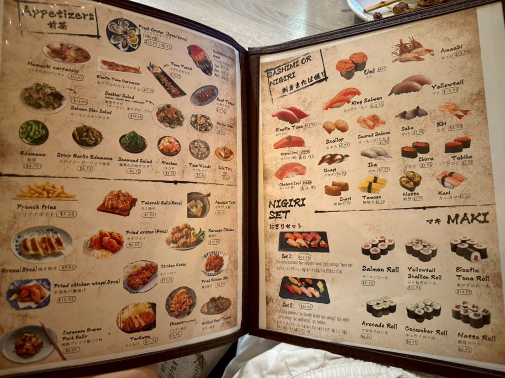 高いように感じるけど、どこに行っても高い(笑)。私たちはおすすめのセット50ドルと少しの天ぷらと串焼きを頼んでおしまい。絶対そこらのステーキ食べるよりこっちのが安いです。