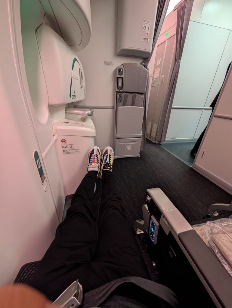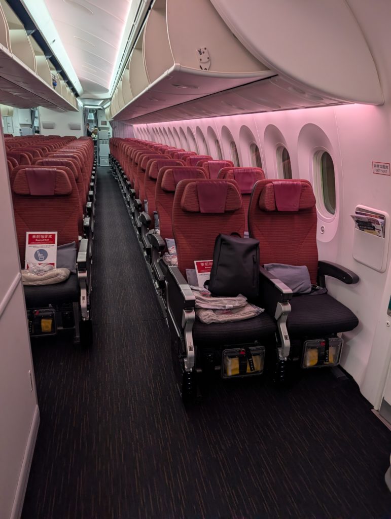 荷物を上に上げないといけませんが、大体「庶民ファースト」と呼ばれるエコノミーの最前列を狙っていきます。モニターにIPATをぶら下げて今日のお供は「教場」。