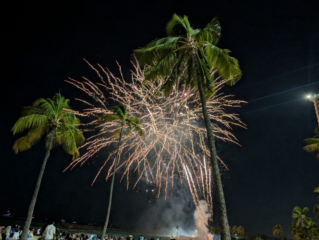 という感じで90分ほどの「AUANA」も終わり、金曜日だけ打ちあがるヒルトンハワイアンビレッジの花火へ。5分だけですが観光客には大人気です。