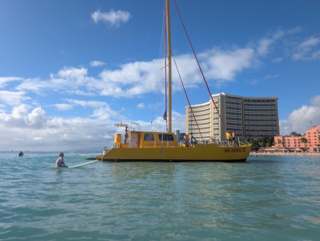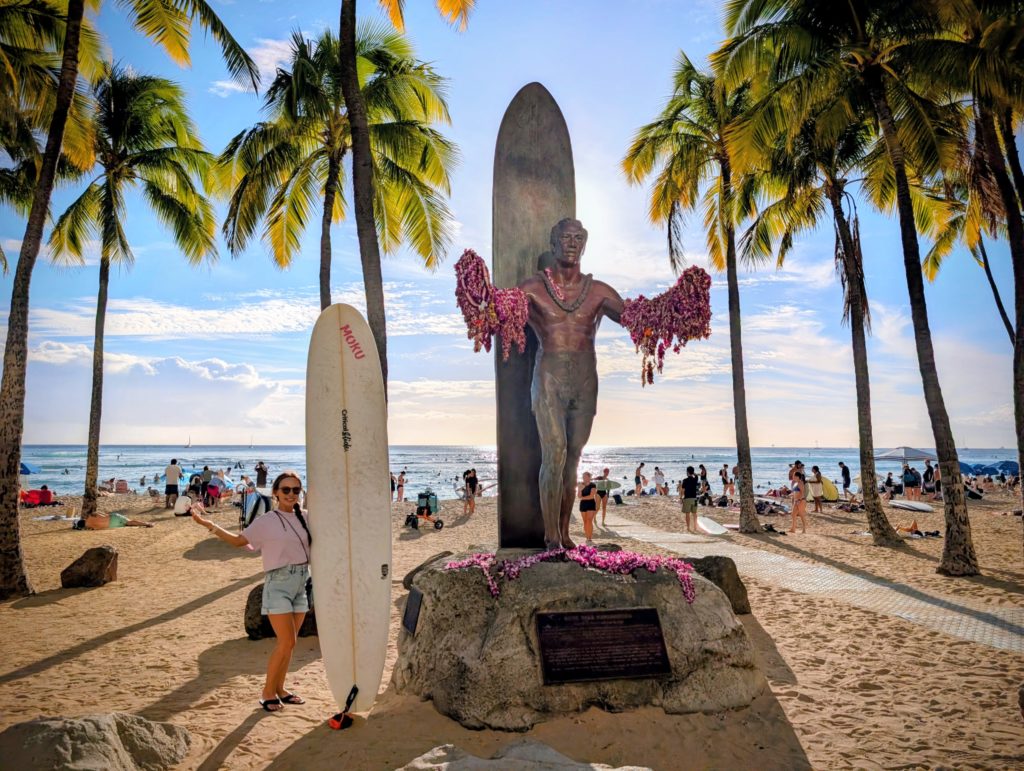 この後はワイキキに戻り、「今回まだ一回もサーフィンしてないんだよね~。」という妻と一緒にワイキキビーチへ。そりゃあサーフィン好きだったらワイキキでやりたいわな。