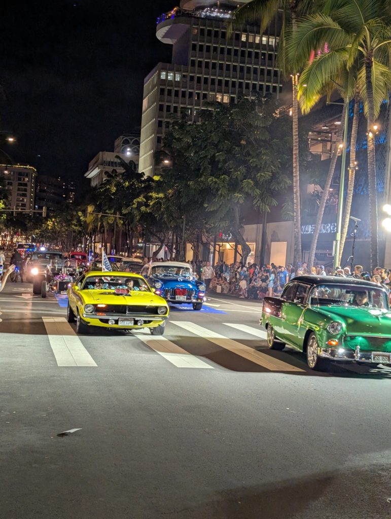 そして「最後のディナーはどうしようね~」とカラカウア通りへ。すると!ホテルのエレベーターに貼ってあった「パールハーバーのアニバーサリーパレード」がやっていました。