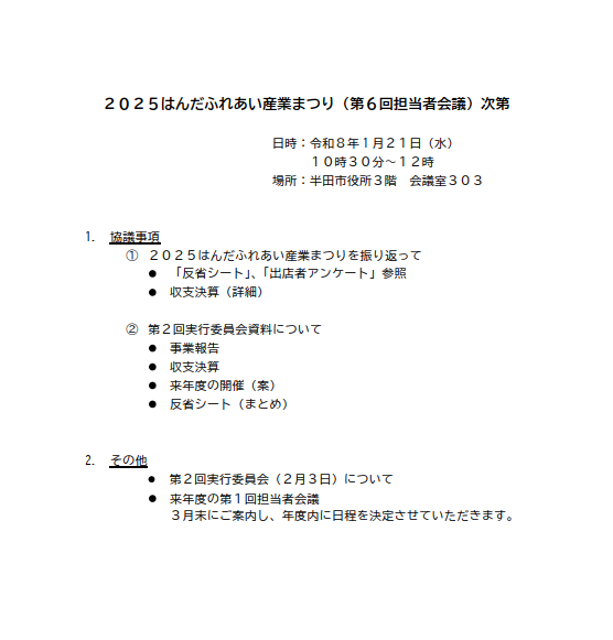 そして翌日の21日。今年度最後となる第6回はんだふれあい産業まつりの担当者会議がありました。来月は実行委員会がありますので、そちらに提出する資料の確認が本日の議題。