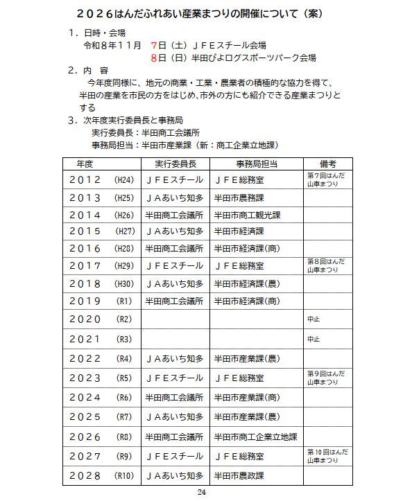 そしてR8の産業まつり開催日程も出てきました。令和8年11月7・8日です。私たちは「半田ぴよログスポーツパーク」が会場となりますので「11月8日(日)」。みなさんスケジュールロックをお願いしますね~。